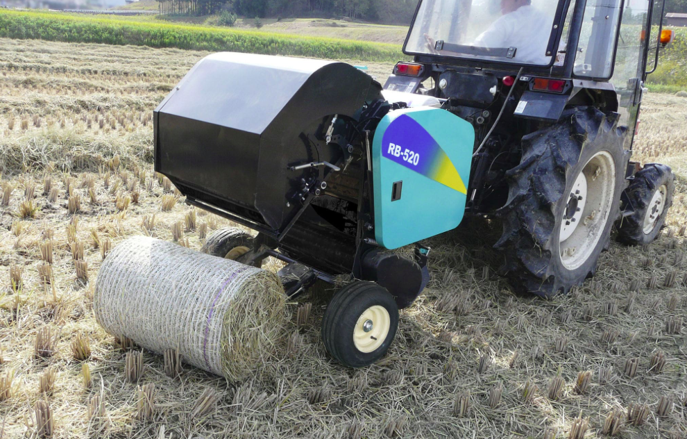 Japonský balíkovač na kulaté balíky s komorou délky 68 cm, průměr balíků 50 cm, vázání do sítě.