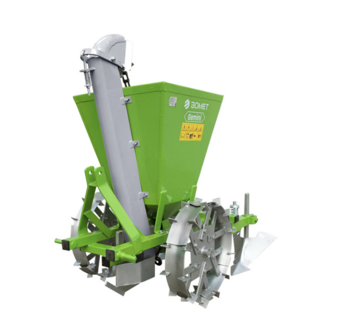 Jednořádkový sazeč brambor BOMET GEMINI S239/2 v jednom pracovním cyklu vyorává brázdy, automaticky sází brambory a zahrne je.